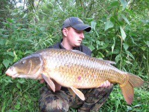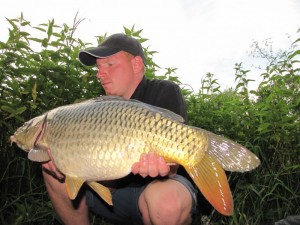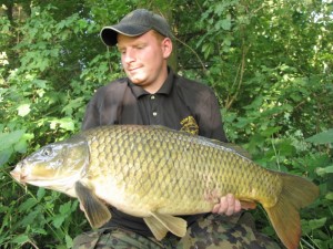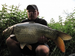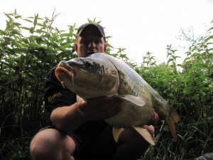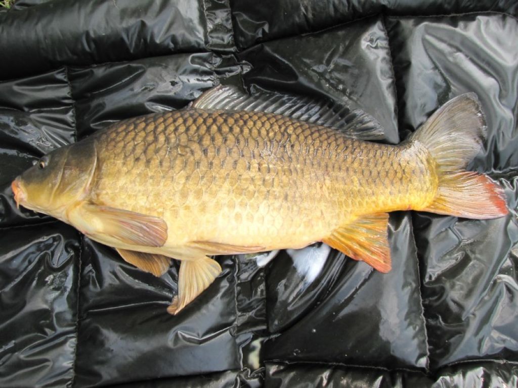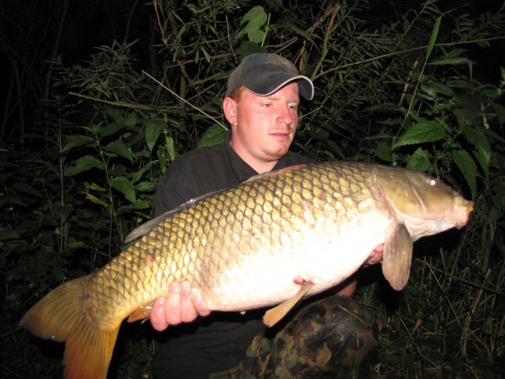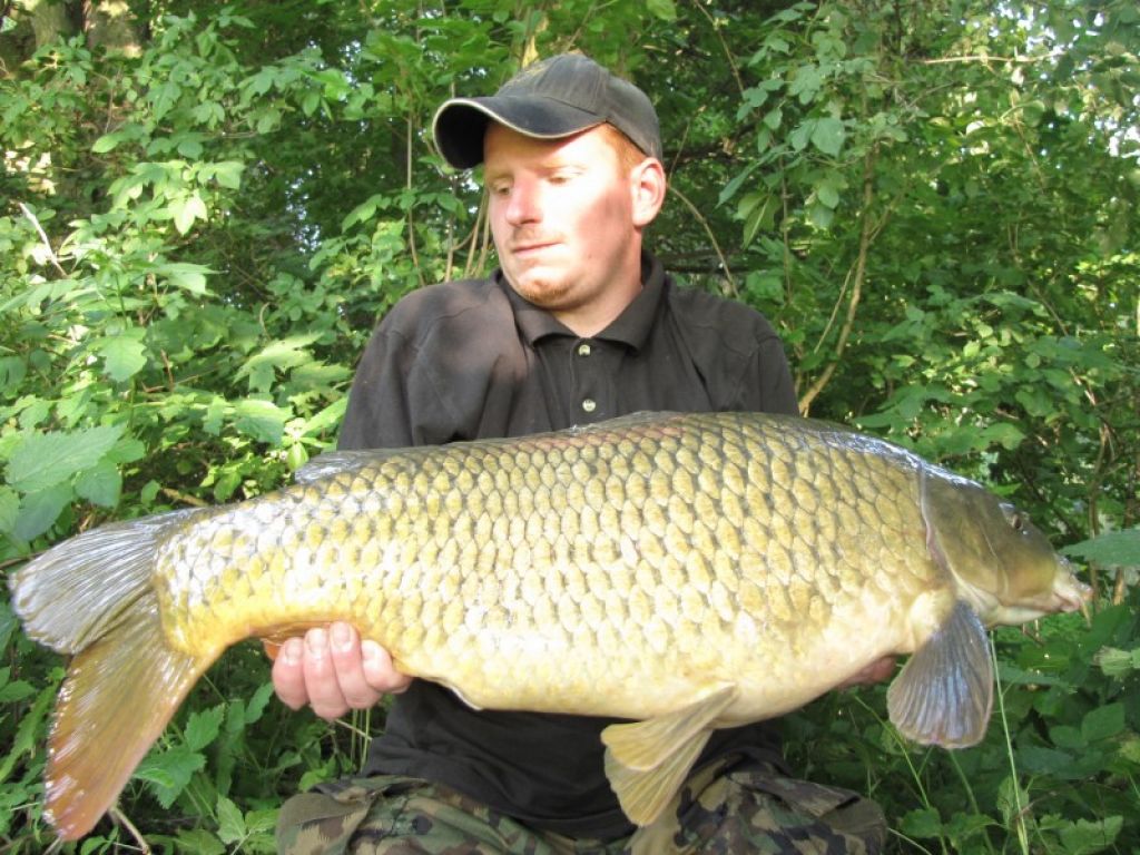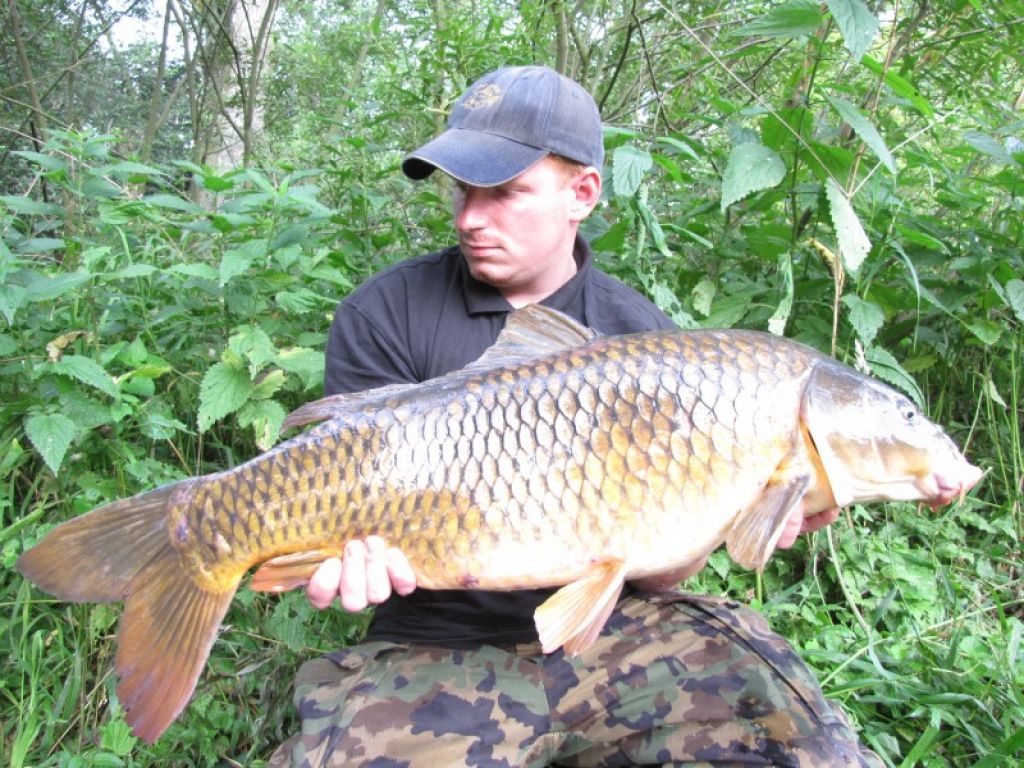 V noci jsem toho moc nenaspal, protože se mě snažili zničit komáři. Nevím proč, ale ani mě nenapadlo zapnout si na noc bivak a nechat otevřené moskytiéry. Až když mi volal kamarád Dalibor a řekl jsem mu o svém problému, tak mi poradil tuto jednoduchou základní věc, která mě prostě asi z těch veder nenapadla. Ve čtvrtek mě v 6 hodin ráno probudil zvuk mého podomácku vyrobeného příposlechu. Když jsem doběhl k prutům, kapr si bral z cívky vlasce, co to šlo. Záběr tentokrát přišel na levý prut pod břehem u keře. Nechal se zlákat na kaviár dipovaný v dipu mušle a obalený v powder dipu Carp Zoom mrtvola. Po záseku mohutný tah směřoval od keře do koryta a tak bylo jasné, že musím za kaprem na vodu. Nádherný ranní souboj, kdy nad hladinou byl ještě slabý mlhavý opar, sluníčko už příjemně hřálo a do toho zpívali ptáci, jsem si vychutnával plnými doušky, jako by to měl být můj poslední kapr v životě. Tento bojovník se držel stále u dna. Když se mi ho podařilo vypumpovat k hladině, tak následoval silný, plynulý tah zpět ke dnu. Takhle to následovalo ještě asi 2x a v podběráku se objevilo krásné 85 cm dlouhé 11 kg vážící nízké šupinaté torpédo.