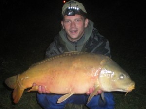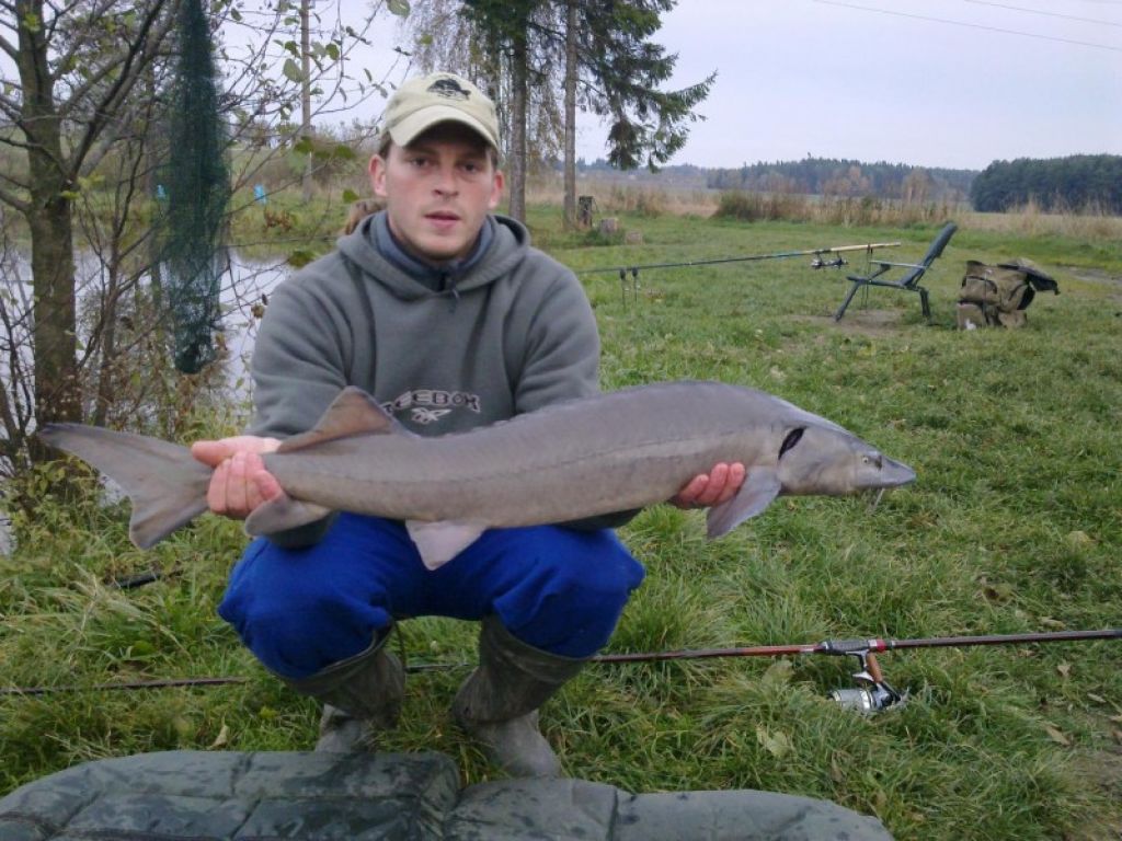 Druhou montáž navlékám dvě ořezané kuličky Casii a spodní kuličku také obaluji těstem. Jarda má nastraženy na obou prutech pelety, kterým on osobně velmi věří. Po necelé hodince se ozývá pravý prut s nastražením boiliesem Casia. Chytám prut a přisekávám. Ryba se zdá být pěkná. Po pár minutách zjišťuji, že jde o jesetera, kterých v tomto revíru je také mnoho. Po podebrání, zváženi a změření na podložce zní výsledek takto: 109 cm 6,85 kg. Rybu pouštíme a znovu nastrahuji Casii. Další dvě hodiny se nic neděje, jen počasí se ochlazuje, a proto se převlékáme do teplejšího oblečení. Po domluvě s Jardou docházíme k dohodě, že budeme spát v autech. Tam je alespoň možnost zatopit. Bivak tedy zůstává v autě. Jarda má pár záběrů, ale nic k záseku. Je zima, a tak jdeme spát. Je půl jedné ráno a opět se ozývá pravý prut s nastraženým boiliesem. Vylézám z kufru auta a sekám. Ryba je bojovná, zatím se mi jí nedaří otočit a stále jede dál a dál od břehu. Dotahuji brzdu a doufám, že ryba souboj vzdá a otočím ji. Bohužel se mi to nedaří a ryba se mi vyřezává. Naštvaný smotávám prut a kontroluji háček. Zdá se být v pořádku. Navlékám nové kuličky a nahazuji zpět do míst, kde přišly oba záběry. Mezi tím je Jardův swinger připevněn k prutu. Brzda hrčí a Jarda přiskakuje k prutu a přisekává. „Nic“, vychází z Jardových úst. Nahazuje zpět.