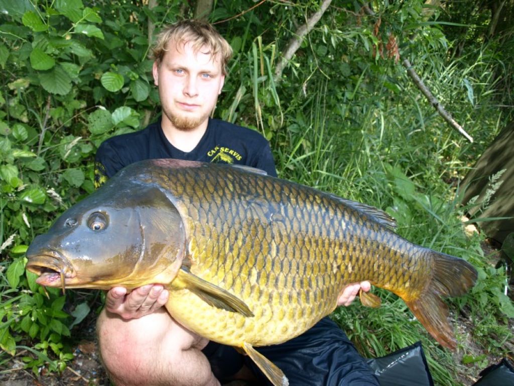 V době od 30. 7. 2010 do 8. 8. 2010 jsem se na ryby vypravil sám. Po obhlídce vody jsem zjistil, že místo, kde jsme již bodovali čtyřikrát je volné. Má volba byla jasná. Na tuto výpravu jsem byl vybaven novým mix boilí s příchutí murena - višeň a banán – oliheň. Je to novinka od pana Václavíka a tak mi ji dal na otestování. Po nezbytné přípravě jsem nahodil oba pruty na výše zmíněnou mělčinu, která je od našeno místa vzdálena necelých sto metrů ale pouhých čtyřicet metrů od břehu. Jako návnadu jsem použil boilí oliheň a muréna – višeň. Samozřejmě bylo nutné nakrmit již zmíněnými peletami Halibut. Neuplynulo ani 30 minut a již ticho prořízl zvuk mého hlásiče. Po krátkém boji byl na břehu šupináč 85 cm a 10,5 kg na nové boilí muréna – višeň. První dva dny jsem chytil ještě 9 kaprů do 10 kg s tím, že pět na boilí muréna – višeň a čtyři na oliheň. Samozřejmě, že muselo po každém záběru následovat přikrmené malou dávkou krmení. Vzhledem k tomu, že první dva dny mi zhruba polovina zaseknutých kaprů spadla v průběhu zdolávání, rozhodl jsem se vyměnit háčky Korda Wide Gape velikosti 6 za háčky Ashima Super Broken velikosti 2. Tato změna se mi v dalších dnech hodně osvědčila. Do 5. 8. 2010 jsem chytil cekem 22 kaprů,z čehož 15 na boilie muréna – višeň a z toho 6 kaprů bylo v rozmezí od 10,1 kg do. 13,1 kg. Jelikož postupem času záběrů stále ubývalo, nezbylo mi nic jiného než udělat nějakou změnu. Posunul jsem krmné místo podél břehu k rákosu, kde jsem mohl bez problémů zakrmit větším množstvím koulí a pelet. Změna místa, ryba jistá...Na tom něco bude. Začal jsem krmit a chytat podél rákosu ve vzdálenosti do dvou metrů od něho. První zákrm a nic. Začal jsem trošičku váhat jestli jsem zvolil dobře, ale ráno moudřejší večera. Další den ráno jsem ve čtyři hodiny nahodil, zakrmil a do desíti hodin měl jenom dva záběry, ale stále jsem pravidelně přikrmoval. Je půl jedenácté, slunce pálí a kapři se válej líně na hladině. Pip...pip...píííí rozeřval se mi hlásič a po krátkém boji podebírám 9ti kilového šupíka. Vyměním kuličku, nahazuju a ve chvíli, kdy chci položit prut zpátky do stojanu, se mi špička ohne prudce doleva. Přisekávám, užívám si tu pohodu a za chvíli přivádím do podběráku mohutného šupináče. Má 15,7 kilo a 93 cm a dostal chuť na boilie muréna – višeň. Ten den ještě muréna – višeň kromě jiného bodovala u dalších 3 kaprů přes 10 kilo. Následující den mě přišli na břeh navštívit kapři 14,6 kg a 12,3 kg, kteří byli jako třešnička na dortu téhle velmi vydařené výpravy. Celkem jsem chytil 53 kaprů o celkové váze 449,7 kg a celkové délce 3 975 cm. Převážné množství ryb jsem nachytal na novinku muréna/višeň a banán/oliheň a proto jsem si je oblíbil stejně jako už léta osvědčenou oliheň.