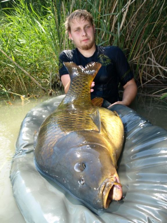 V krátkosti se zmíním jen o několika dnech. Na příklad 30. 6. 2010 chytá Michal sám a já s Milanem plníme pracovní povinnosti. Ve čtyři hodiny ráno vstavá a nahazuje na mělčinu, která vystupuje pozvolna z hlobky pěti metrů na hloubku 1,8 metrů a je na ní písčité dno po trávě ani památka. Přes noc nechal dipovat jednu kuličku v Biogelu a další v dipu s přichutí olihně, což se mu jak za okamžik uvidíte náramně vyplatilo. Kobrou ještě zakrmil směs Halibut pelet a 20 mm boilí oliheň a než se rozmyslel co si dá k snídani přichází první záběr. Neváhá a seká...o pár minut později je v podběráku krásný šupináč 83 cm s váhou 11,8 kg. Na začátek dne dobrý řekl si, ale tím to Vážení čtenáři rozhodně nekončí...! Znovu nahazuje a jde přikrmit. Ještě není ani v půlce cesty zpět a už slyší z dálky hlásič. Rychle proběhne úzkou cestičkou a přisekává. Ryba si nekompromisně bere asi 30metrů a pak se mu jí daří konečně otočit. Jede doprava a pozvolna se nechává zdolávat. Těžká ryba říká si v duchu, ale nechce nic uspěchat a tak kapra zbytečně nerve. Po pár výpadech u břehu podebírá krásného šupináče který mu svou mohutností bere dech. Rozhodně osobák blesklo mu hlavou a váha to jen potvrzuje, 19,4 kg při 96ti centimetrech. Famózní ryba a opět na oliheň! Následující dva dny jsou rána jako přes kopírák. Po nahození a nakrmení přicházejí další záběry od kaprů 12,3 kg a 14,1 kg.